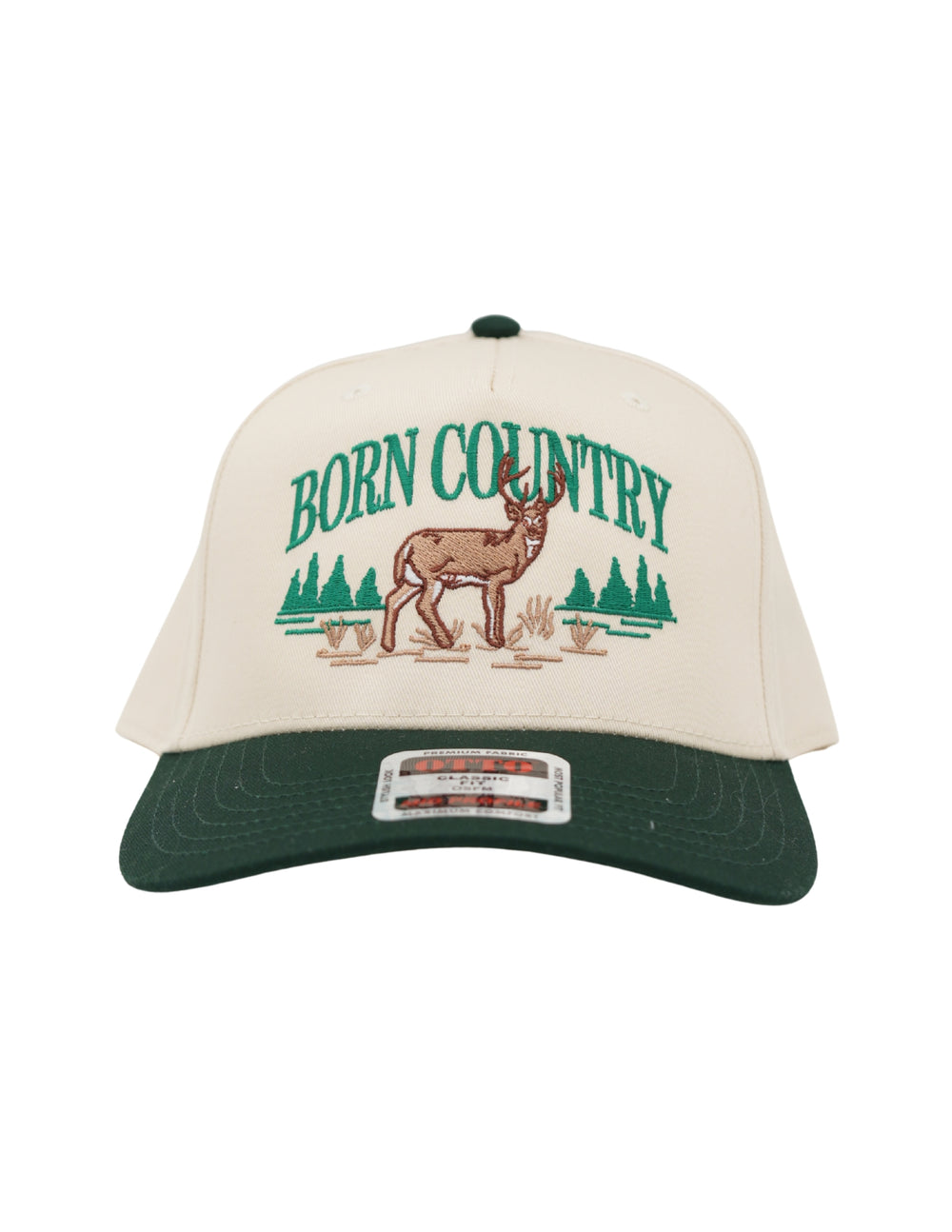 Premium Embroidered Design: “Born Country” lettering with detailed wildlife and nature elements stitched in high-quality thread.