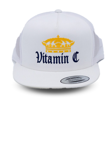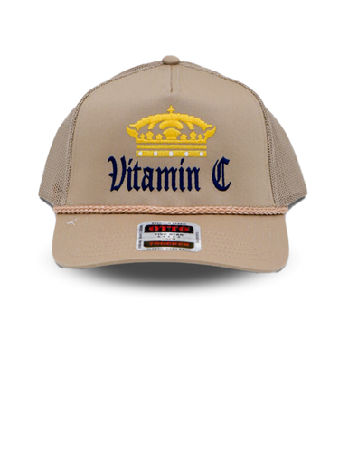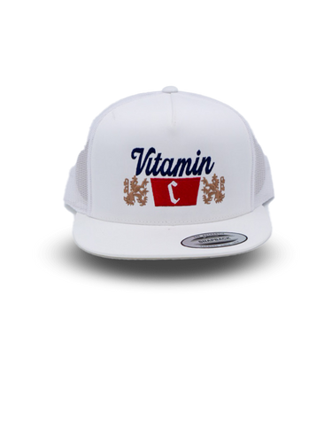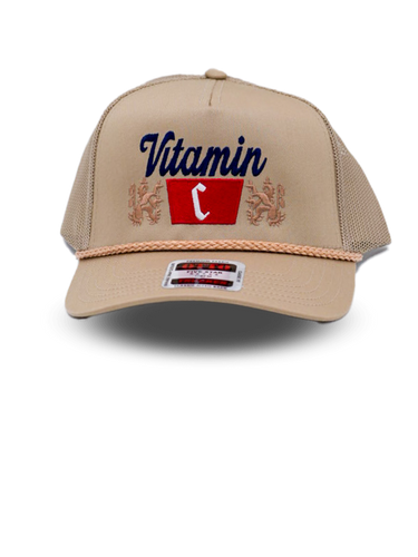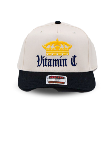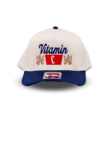 The bold “Vitamin C” text sits front and center in stylized lettering, flanked by subtle decorative elements (mountains, crown, rope detail, or crest) depending on the variant. Available in multiple colorways (e.g. cream & navy, tan & burgundy, black & white), this structured hat blends retro charm with everyday wear.